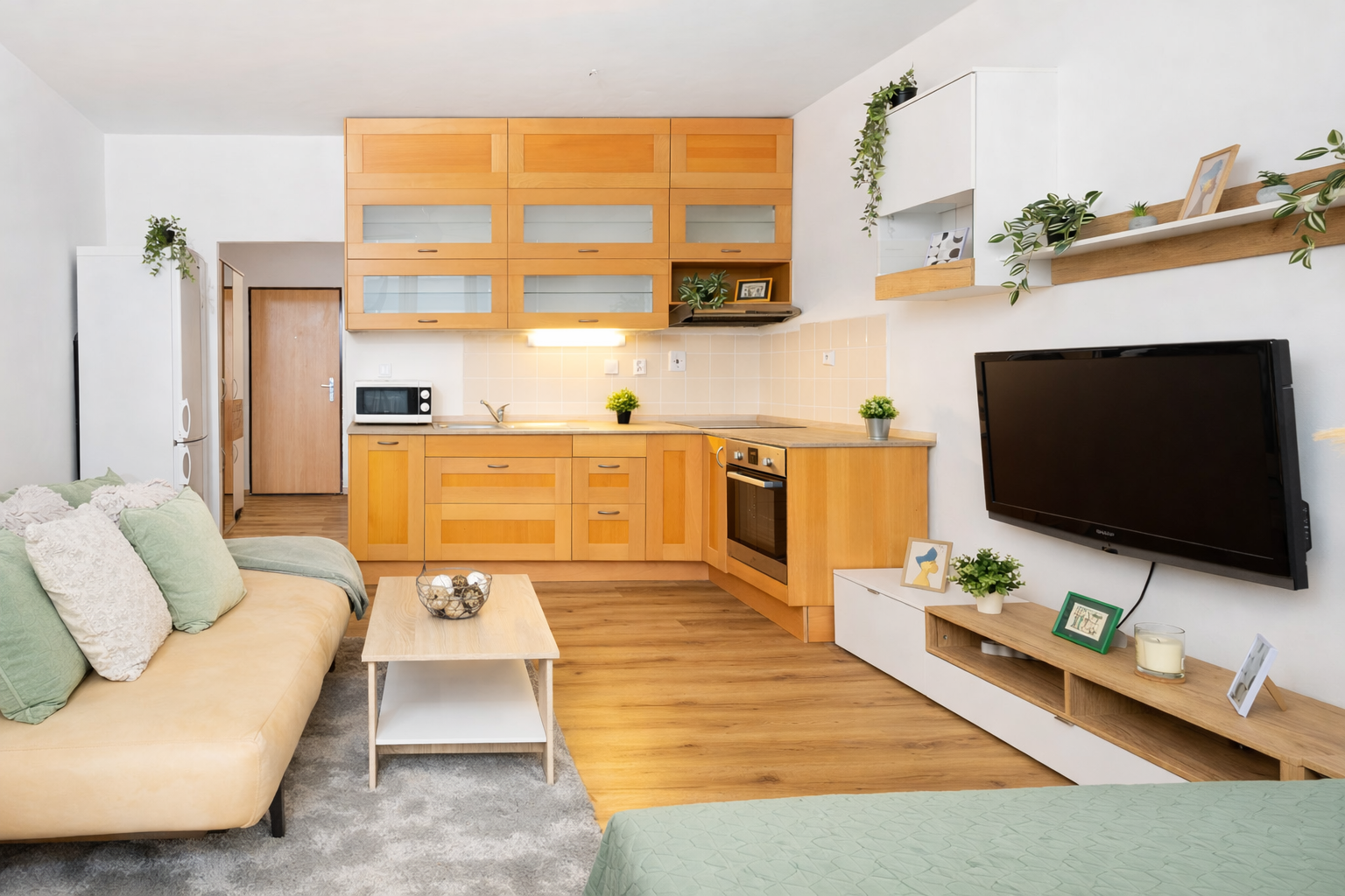– kuchynská linka so vstavanou indukčnou varnou doskou, rúra, digestor, mikrovlka, chladnička s mrazničkou